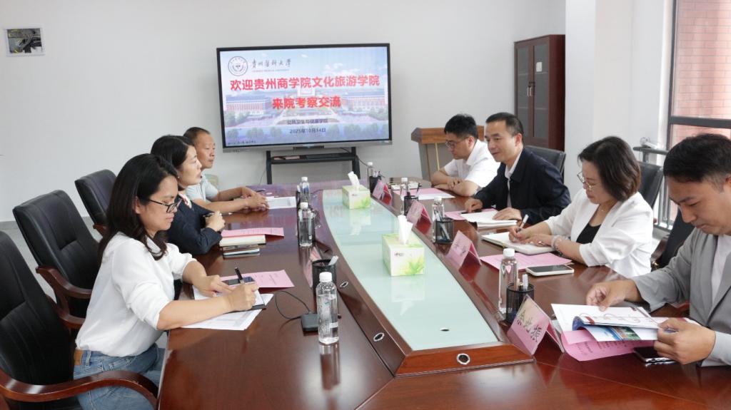 10月14日,贵州商学院文化旅游学院党委书记成志湘、党委副书记、院长安静一行来到公共卫生与健康学院考察,双方在贵州医科大学云漫湖校区博雅楼C3组团2-24接待室举行座谈会,就食品学科建设与发展进行交流。公共卫生与健康学院党委书记郑维薇出席并主持会议;贵州商学院文化旅游学院党委书记成志湘、党委副书记、院长安静、副院长毛宗清以及公共卫生与健康学院党委委员、副院长张清海出席会议;贵州商学院文化旅游学院食品科学与工程专业负责人余此振和公共卫生与健康学院食品科学学系负责人周艳参加会议。