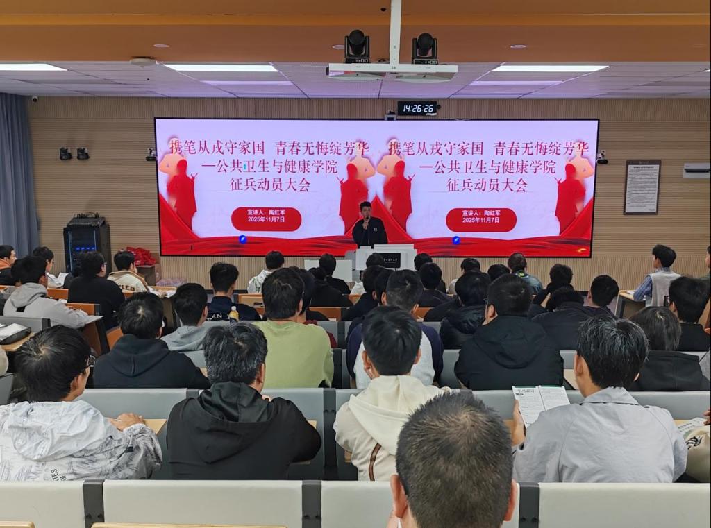 为扎实推进国防动员和征兵工作,激发公卫学子的参军热情。11月7日,公共卫生与健康学院2026年征兵入伍动员会在云漫湖校区公卫组团L111S教室召开。校党委学生工作部国防教育科副科长耿海林、公共卫生与健康学院学生科副科长原琦、辅导员陶红军及学院各专业适龄学生代表100余人参加,分享会由原琦主持。