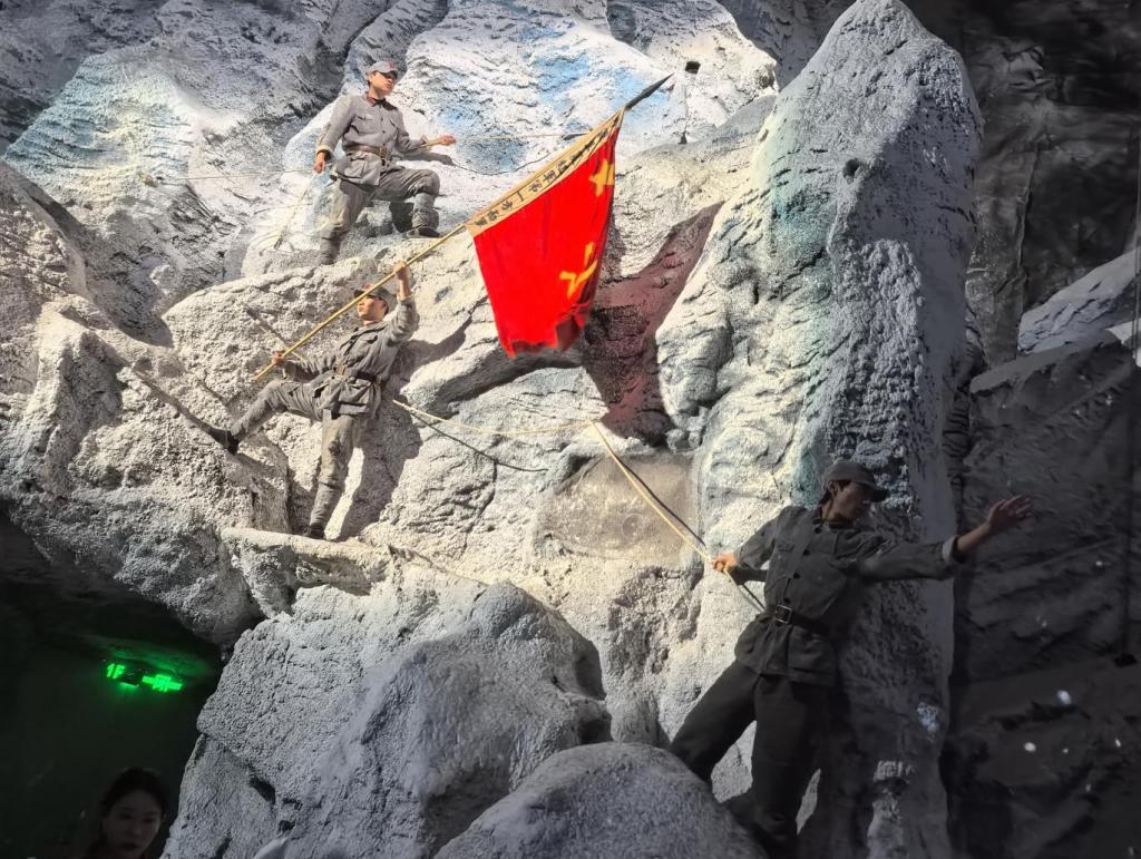 “血火洗礼”篇章中,双曲幕与震动特效交织重现湘江战役的悲壮场景,硝烟气息与枪炮声响营造出沉浸式战场体验,当看到红军战士浴血奋战的画面时,现场学子无不屏息动容。“伟大转折” 展区通过机械结构巧妙切换场景,遵义会议的历史细节清晰呈现,让学子们直观理解 “生死攸关的转折点” 背后的信仰力量。在“砥砺征途”环节,模拟低温环境与实景布置还原了雪山草地的艰险,刺骨寒意中,大家更深刻体会到红军“风雨侵衣骨更硬”的坚韧品格。从“四渡赤水”的军事奇迹到“巧渡金沙江”的机智果敢,六个篇章的沉浸式展演让长征史诗在科技赋能下焕发新生。