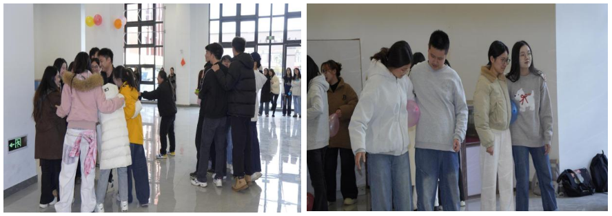 “数字抱团”环节率先点燃现场气氛。同学们围成大圈跟随音乐走动,主持人喊出“7”“5”等数字,大家迅速组队相拥。紧接着的“背靠背运气球”考验默契,各队两两搭档用背部夹球前行,队员们小心翼翼又配合默契,大厅里满是加油呐喊声。