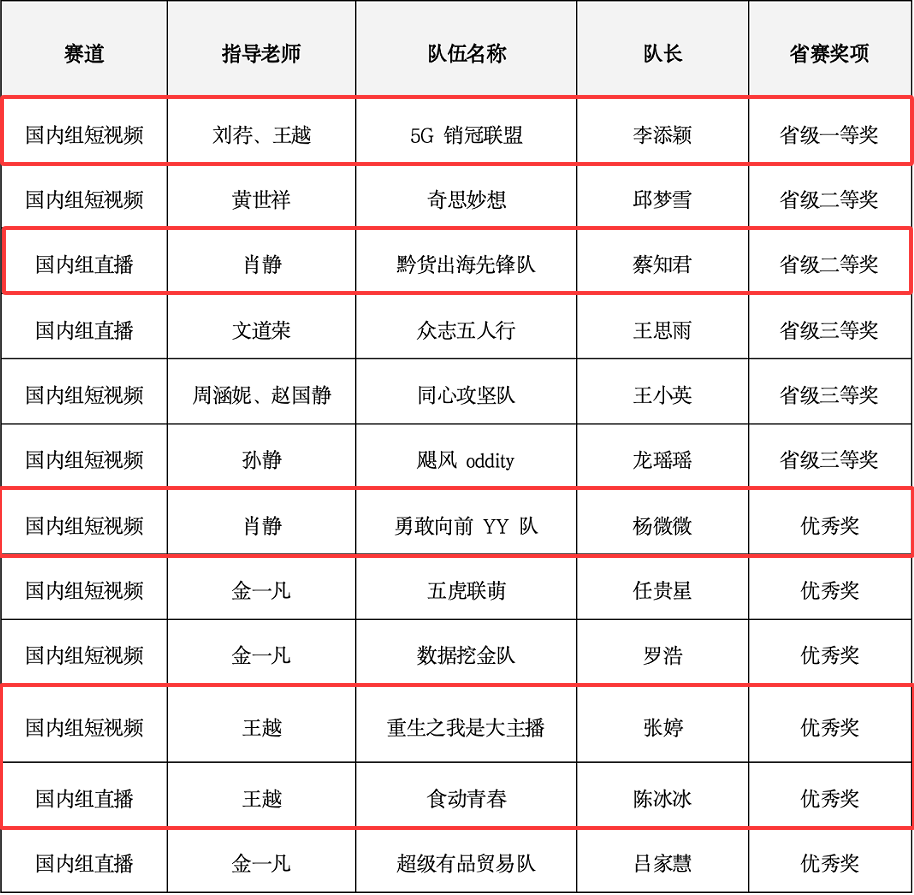 我院参赛队伍展现了强劲的实力与良好的精神风貌。在国内组短视频赛道中,由刘荇、王越老师指导,李添颖同学担任队长的“5G销冠联盟”队荣获省级一等奖;由肖静老师指导,杨微微同学担任队长的“勇敢向前YY队”,获省级优秀奖。由王越老师指导,张婷同学担任队长的“重生之我是大主播”队荣获省级优秀奖;在国内组直播赛道中,由肖静老师指导,蔡知君同学担任队长的“黔货出海先锋队”获省省级二等奖;由王越老师指导,陈冰冰同学担任队长的“食动青春”,获省级优秀奖。