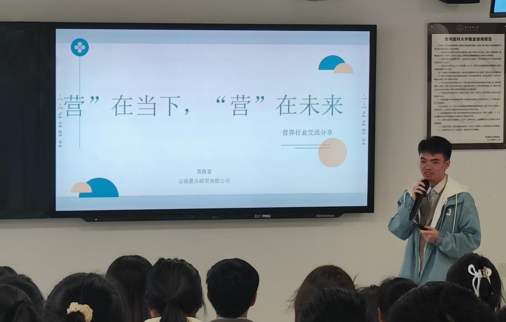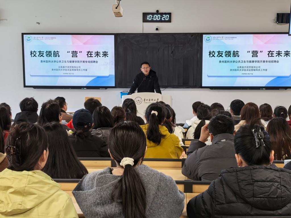 3月27日,公共卫生与健康学院、贵州医科大学医语蓝图辅导员工作室联合举办“校友领航‘营’在未来”食品卫生与营养学专业专场招聘会。云南晨齐商贸有限公司董事长、总经理宋翔,公司运营总监莫隆富(原2014级食品卫生与营养学优秀毕业生),运营总监助理宋依桐应邀出席。公共卫生与健康学院党委书记郑维薇、党委副书记何江、对外服务中心主任魏绍峰、营养与食品卫生学系主任彭小波、辅导员李德健共同参加本次活动。宣讲面向2022、2023级食品卫生与营养学专业学生,由学生科副科长原琦主持。