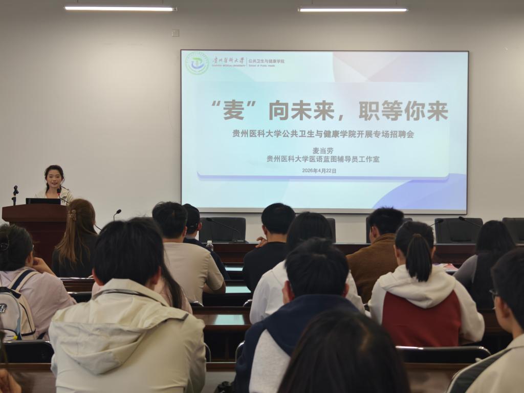 2026 年 4 月 22 日下午,公共卫生与健康学院联合贵州医科大学医语蓝图辅导员工作室在公卫组团举办“‘麦’向未来,职等你来”专场宣讲招聘会。食品科学与工程学系主任周艳、学生科副科长原琦、辅导员李德健及2026届应届毕业生、2023级食品科学与工程学生参加本次活动。