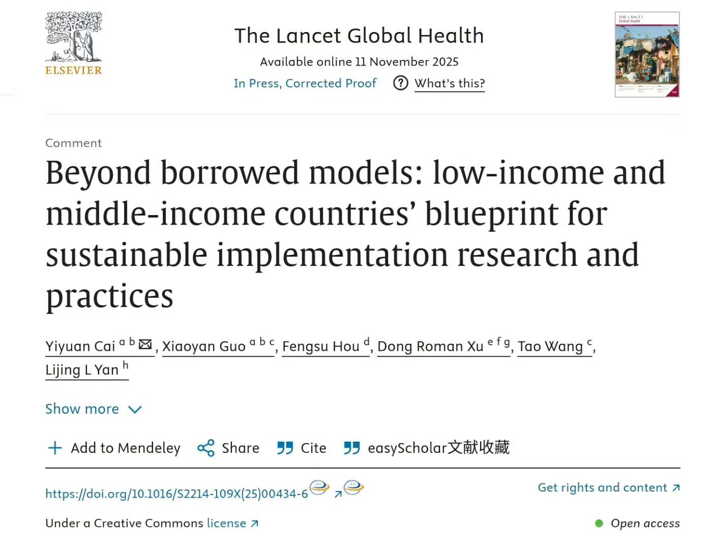 文章直面当前全球健康研究的一个核心难题:众多基于循证实践(Evidence-Based Practices,EBP)证据开展的医疗卫生服务质量改善项目,在外部资金支持结束后难以持续,尤其在资源有限的低、中收入国家。针对这一长期瓶颈,我院蔡毅媛副教授系统性地为低、中收入国家绘制了从“借用他国模型”转向“自主创新实践”的路线图。这一“蓝图”的提出,有助于打破长期以来的学术依赖,推动全球健康更加公平、可持续发展。